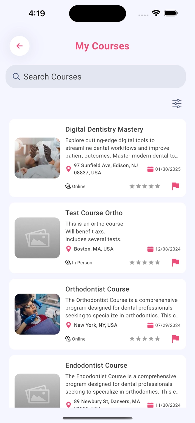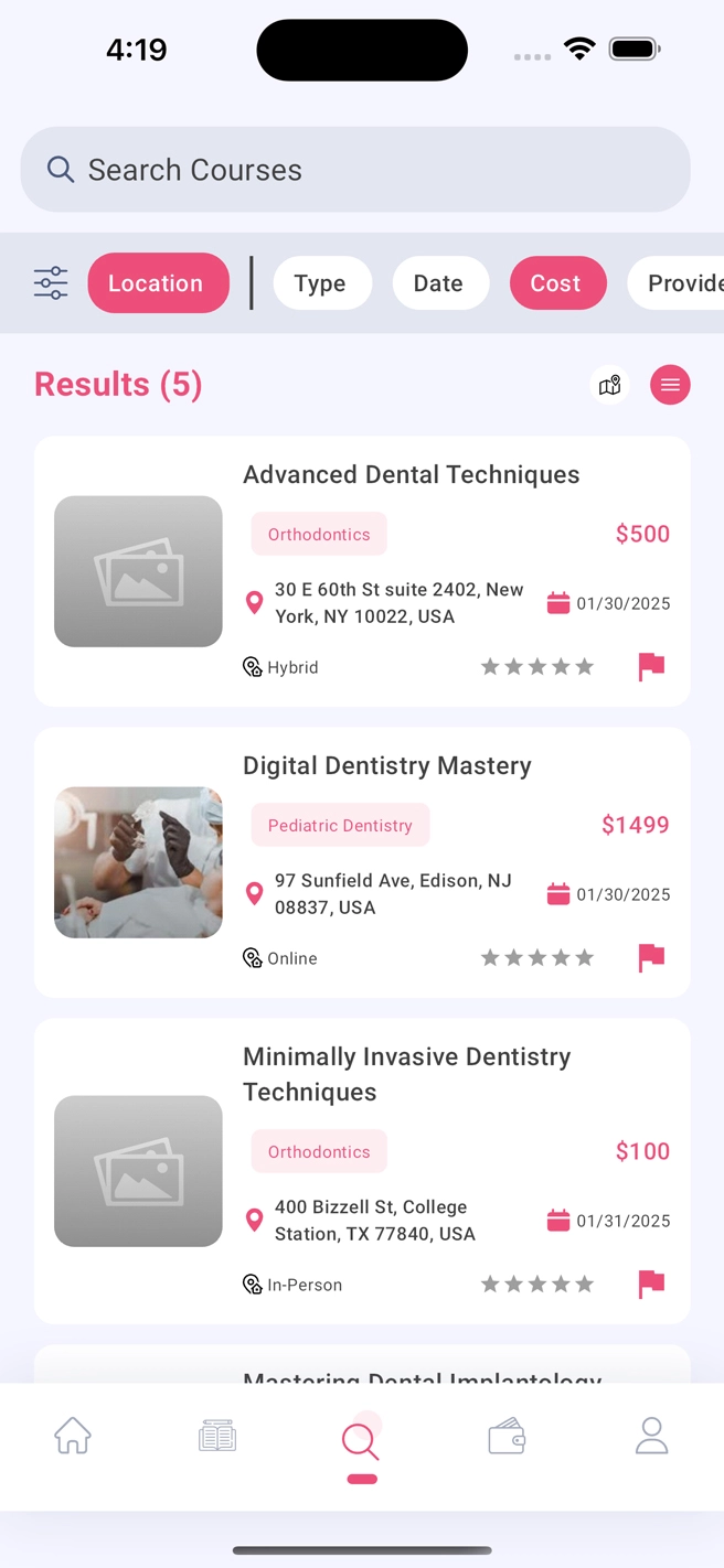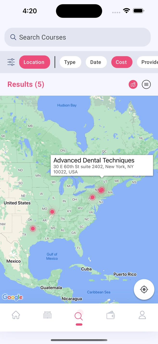 Our software aims to streamline the continuing education experience for dental professionals, saving them time and effort in searching for courses, planning travel, and coordinating schedules. By centralizing CE courses with geolocation and date features, we prioritize convenience, efficiency, and accessibility for our users.